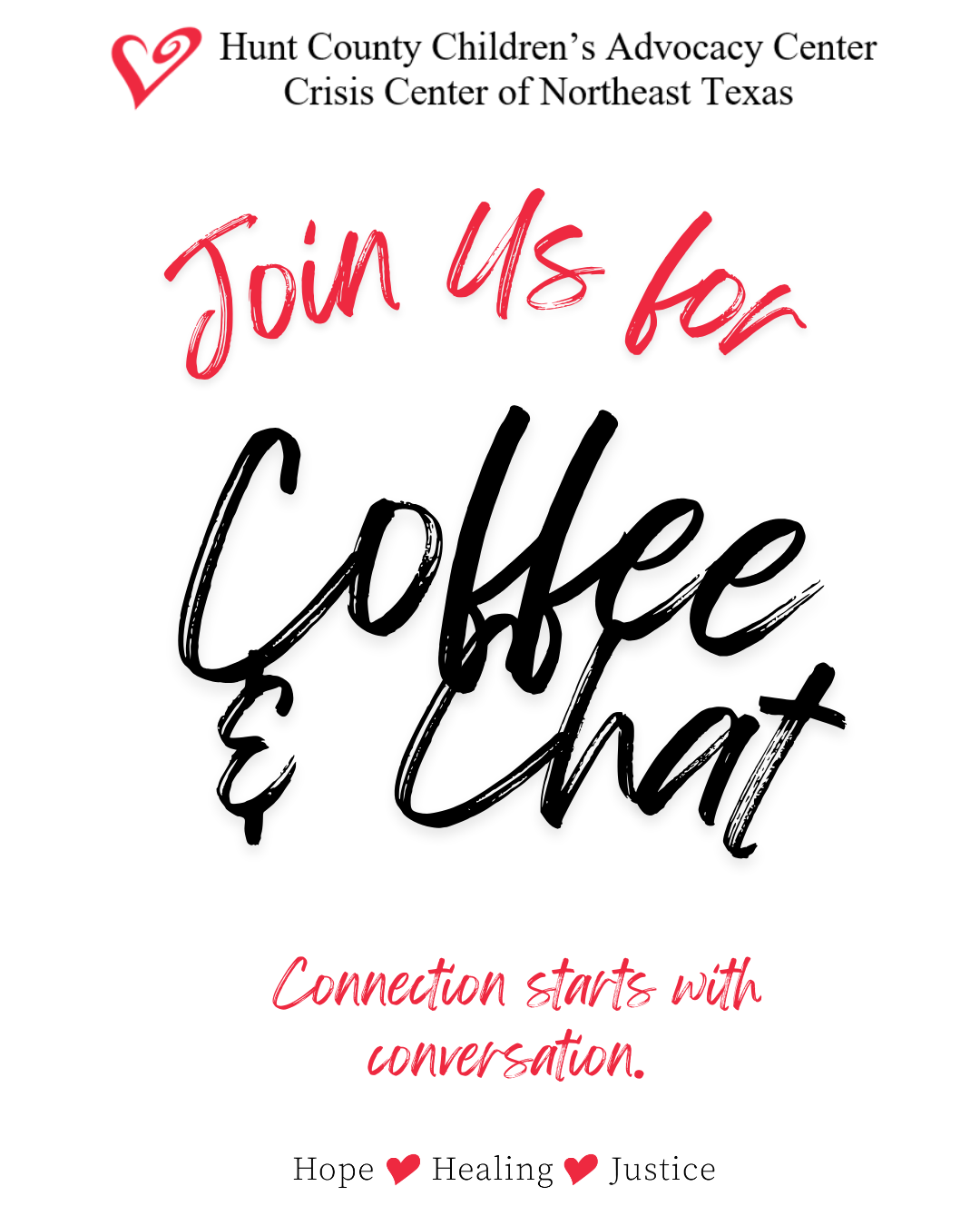 Coffee & Chat is a monthly, casual pop-up hosted by the Community Engagement team at the Hunt County Children’s Advocacy Center and the Crisis Center of Northeast Texas.