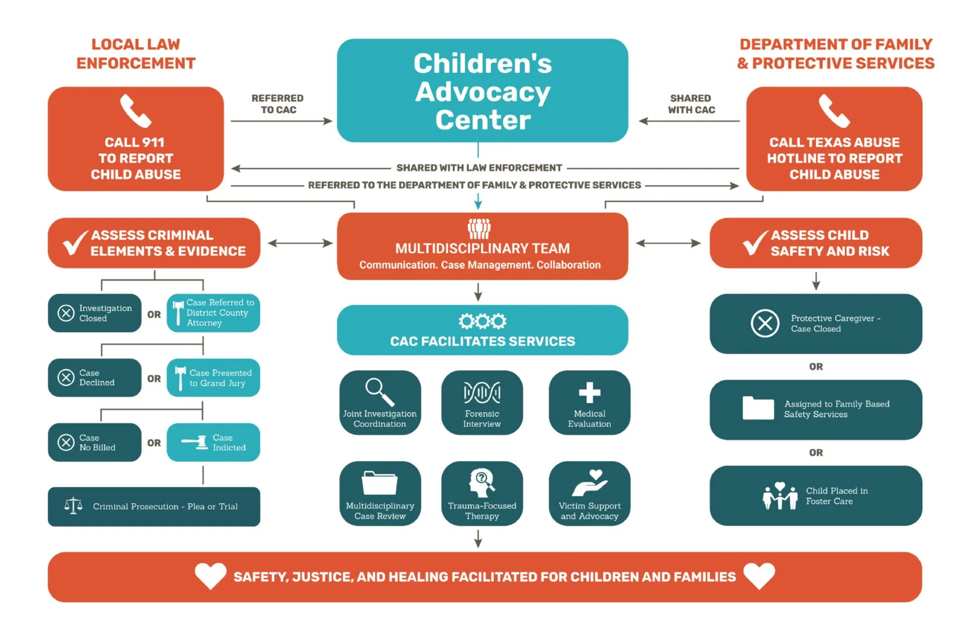 For example, child abuse must be reported to CPS and/or law enforcement. How those agencies proceed with their case will determine which services are available to the children and caregivers involved.